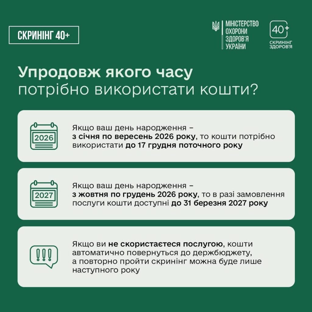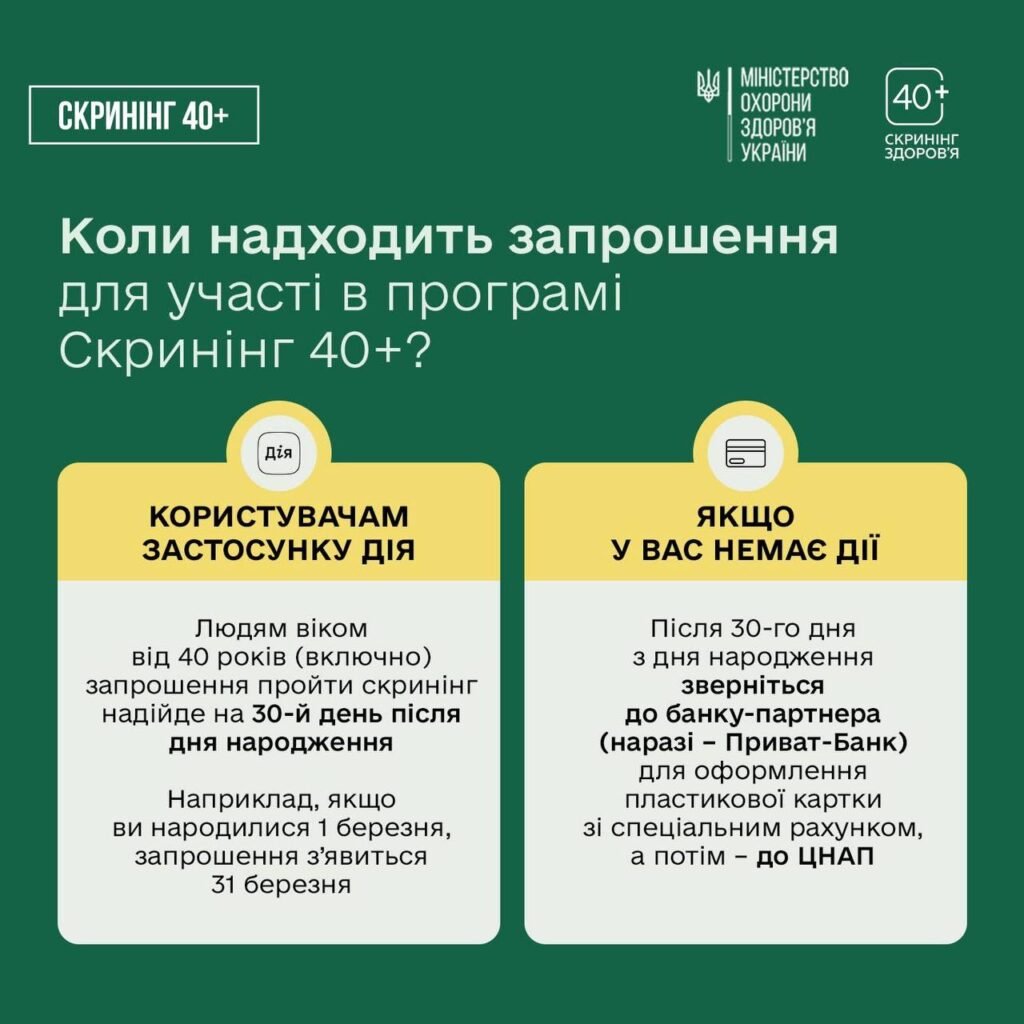 Більше про Скринінг здоров’я 40+ та відповіді на поширені запитання — тут: https://screening.moz.gov.ua.