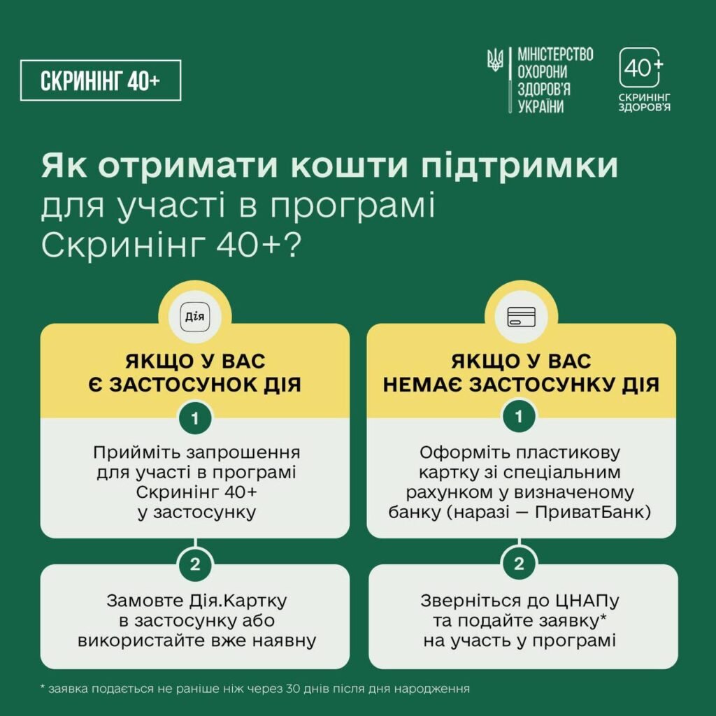 Кожна людина віком від 40 років і старше отримає запрошення на скринінг у застосунку Дія — на 30-й день після свого дня народження. Це стосується всіх українців і українок від 40 років і старше. Після прийняття запрошення необхідно замовити Дія. Картку в застосунку або ж використати свою, уже оформлену. За 7 днів на неї надійдуть кошти — 2000 гривень. Їх можна використати тільки для проходження Скринінгу здоров’я 40+.